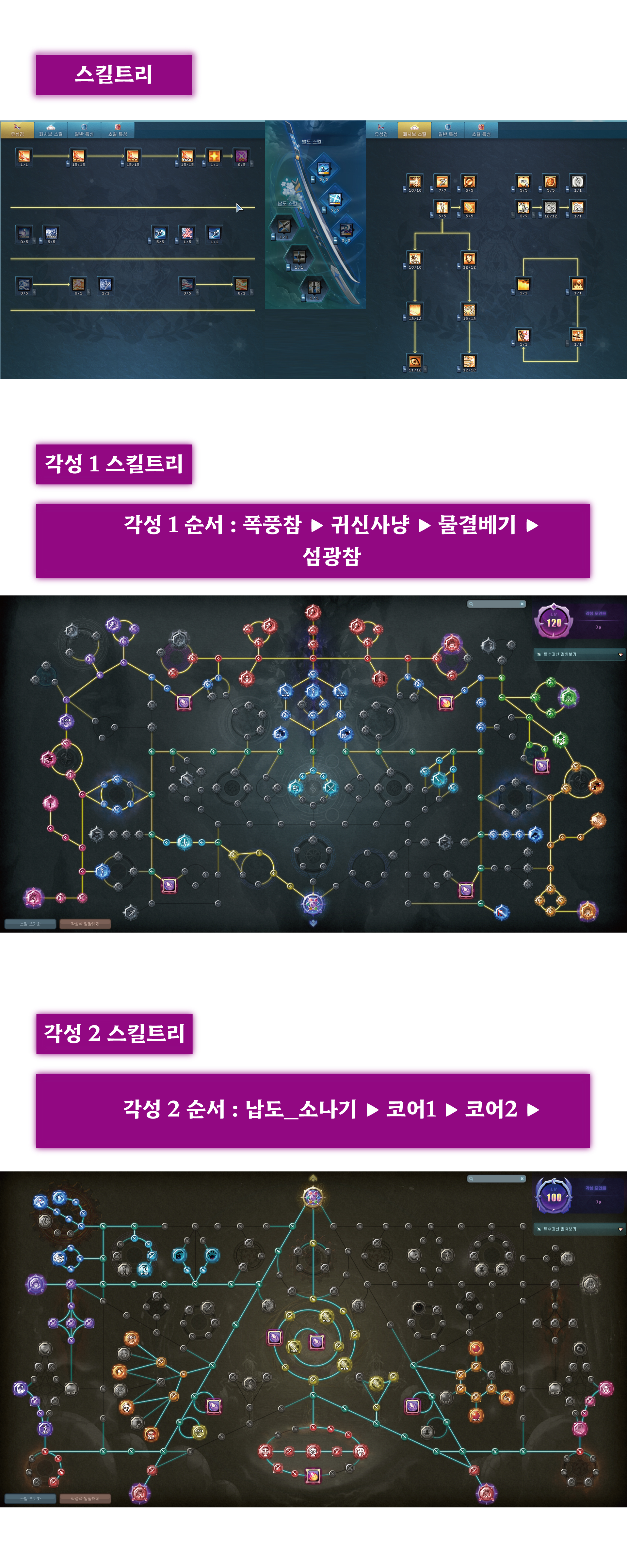 각성1에서 단풍쓸기를 제외한 모든 스킬을 찍고 각성2에서 소나기 / 코어1 / 코어2 순서로 찍었습니다.