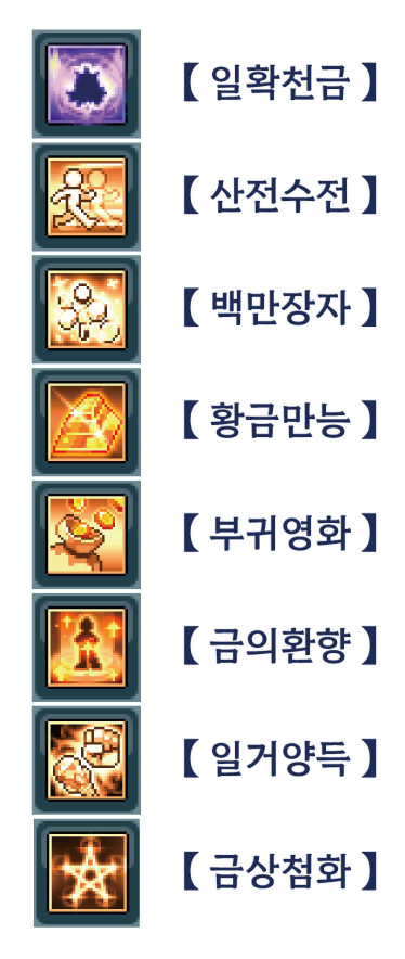 | 소환수 《 리치링 》 | 소환수 《 스킬 》 | ![]() | 【 일확천금 】 : 30% 【 산전수전 】 : 30% 【 백만장자 】 : 150% 【 황금만능 】 : 30% 【 부귀영화 】 : 30% 【 금의환향 】 : 30% 【 일거양득 】 : 25% 【 금상첨화 】 : 25% ※각성 리치링 스킬 만랩 기준입니다. | 소환수 리치링을 꾸준히 성장 후 《 소환수 스킬 강화 주문서 》 , 《 상급 소환수 스킬 강화 주문서 》 을 사용해 각 스킬 레벨 업 |