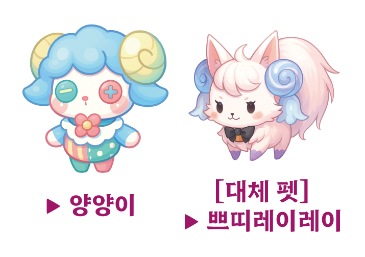 | 메인 펫 《 메인으로 착용시 》 | 양양이 | ![]() | 양양이 : 100% 쁘띠 레이레이 : 70% | 한정 판매 경매장 구매 (권장) |