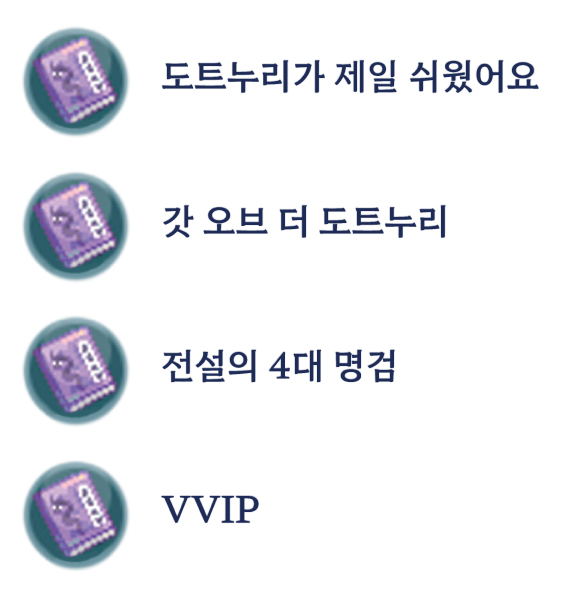 | 타이틀 도감 (오른쪽 효과 모두 적용 가능) | ![]() | 【 도트누리가 제일 쉬웠어요 】 : 20% 【 갓 오브 더 도트누리 】 : 10% 【 전설의 4대 명검 】 : 5% 【 VVIP 】 : 10% | 다양한 타이틀을 통해 타이틀 도감 활성화 [ 타이틀 도감 내실 보러가기 ] |