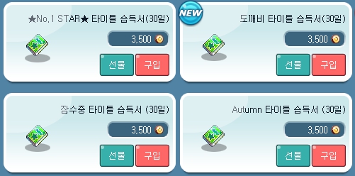 | 타이틀 | 캐쉬샵 타이틀 | ![]() | 10% | 캐쉬샵에서 다양한 타이틀중 1개 사용 (3,500 Oz) 캐쉬샵에서 "타이틀" 검색 |