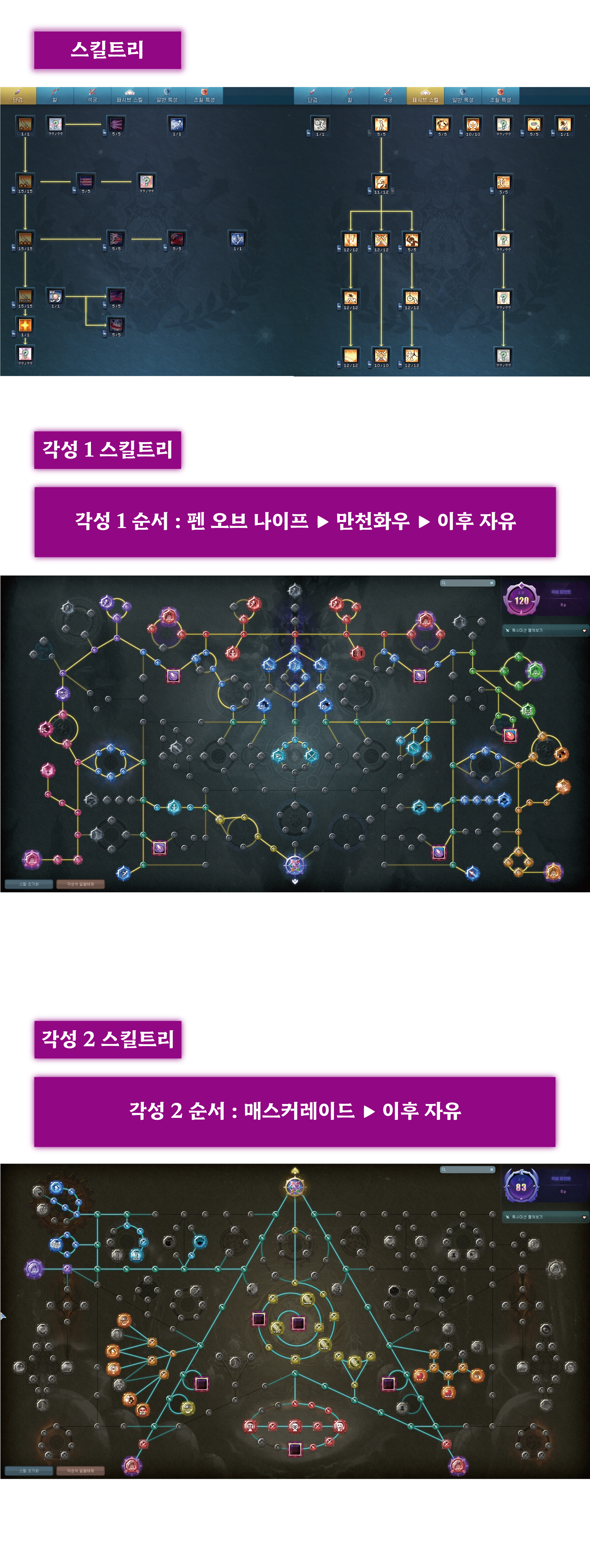 주딜링기인 만천화우(쉴드) + 매스커레이드(상단이동 + 댐감) + 팬오브나이프 (피흡) 위주로 상황에 맞게 쓰면서 +@ (중간중간에 각성 1, 2 자주 써주면서 플레이하면 됩니다.)