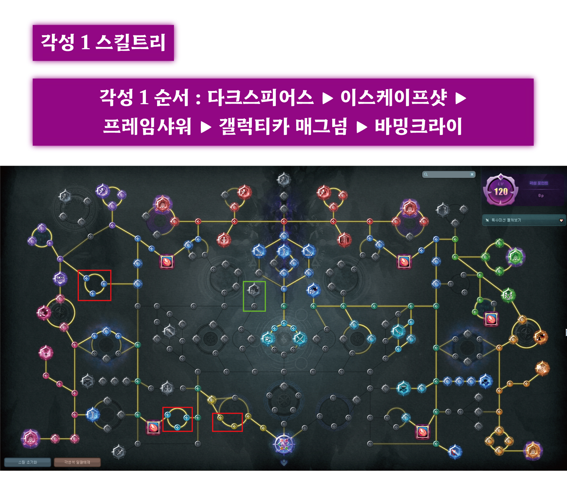 빨강색 부분은 이동속도 증가노드인데, 이동속도 충분하다면 다른쪽으로 찍어서 딜 더 챙기는게 좋음