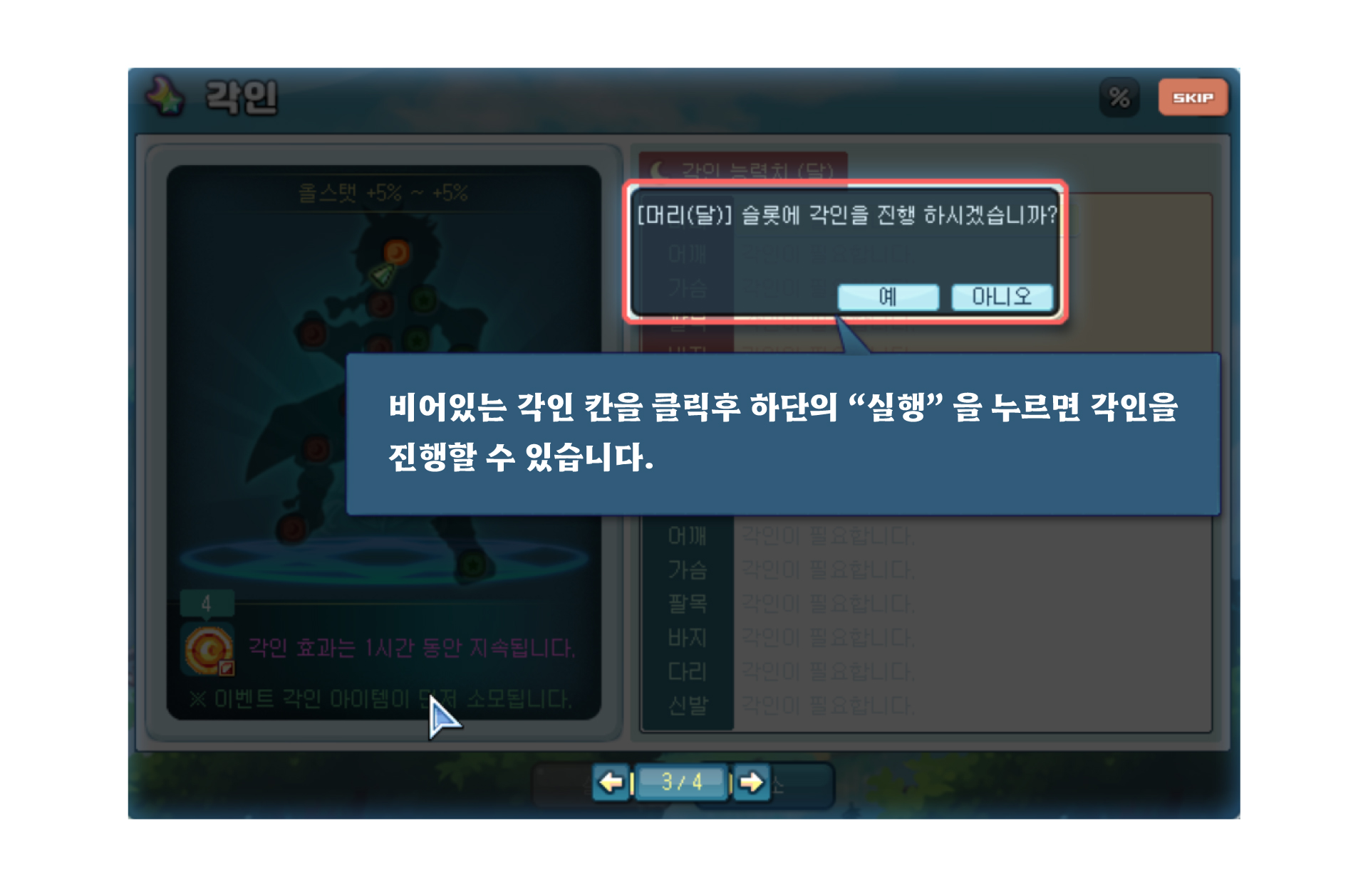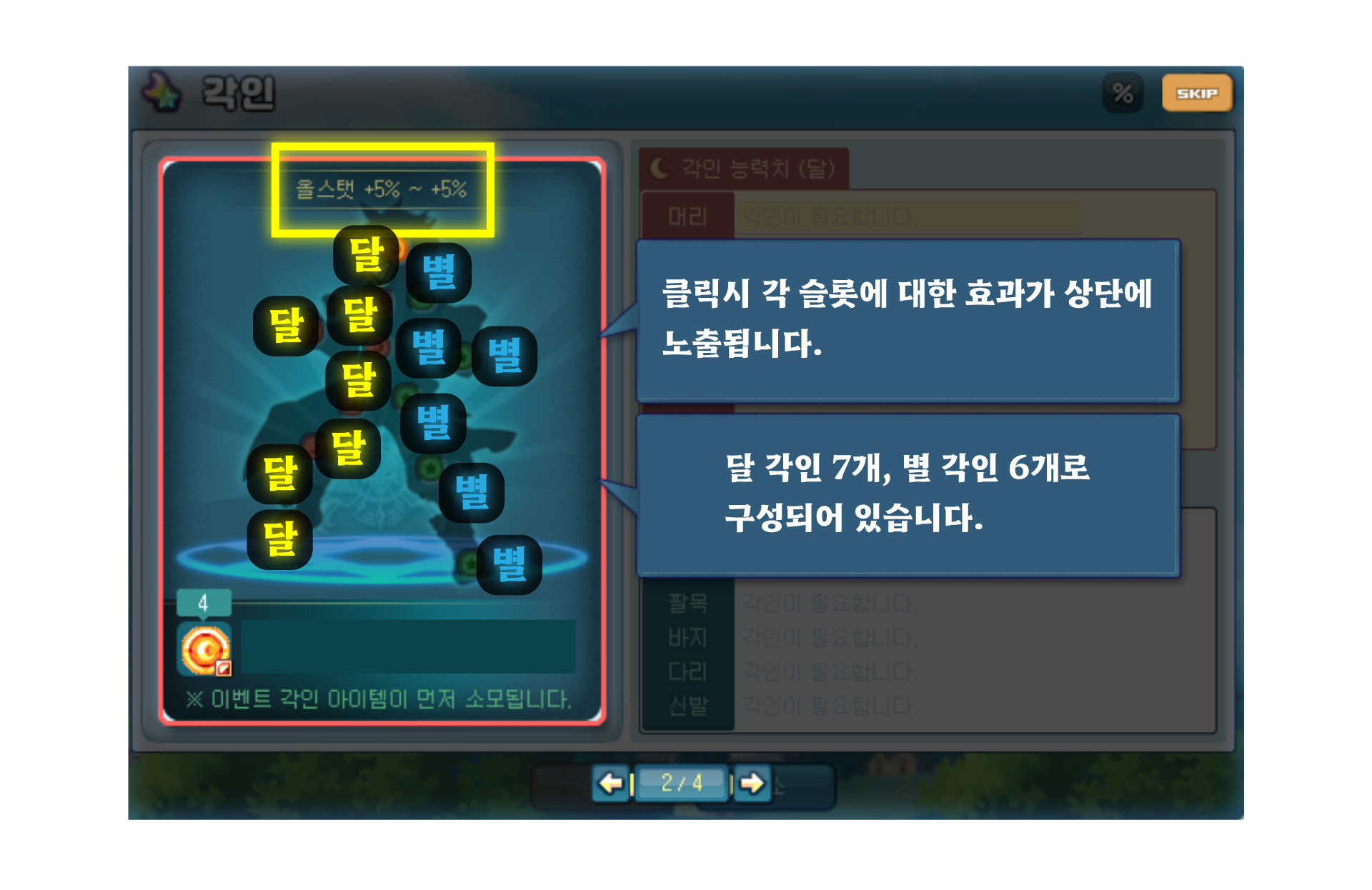 ▶ 달 각인은 달 슬롯 1칸 오픈당 《 달이 새겨진 각인석 》 이 4개 필요합니다.