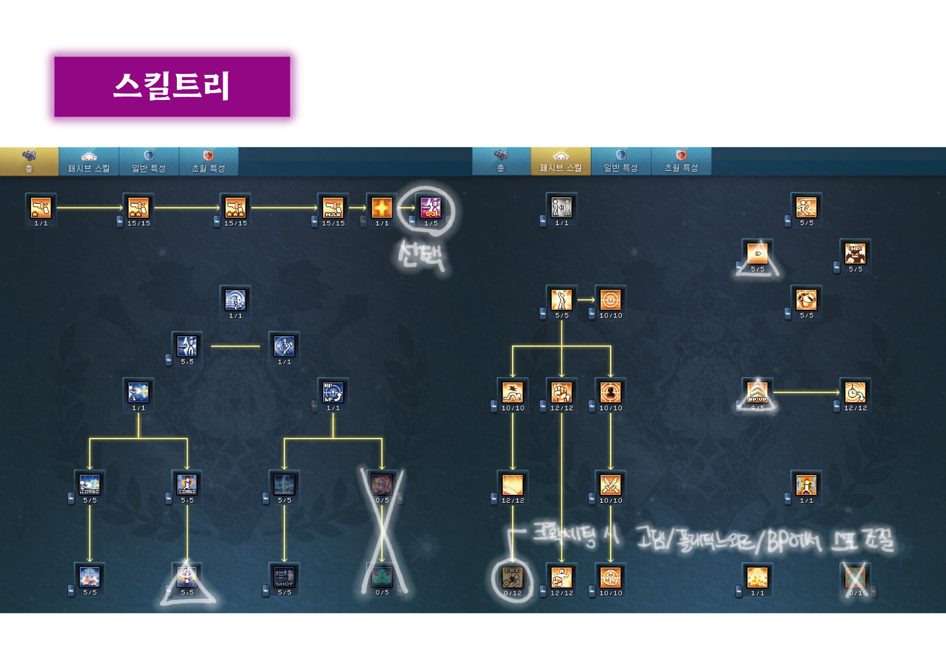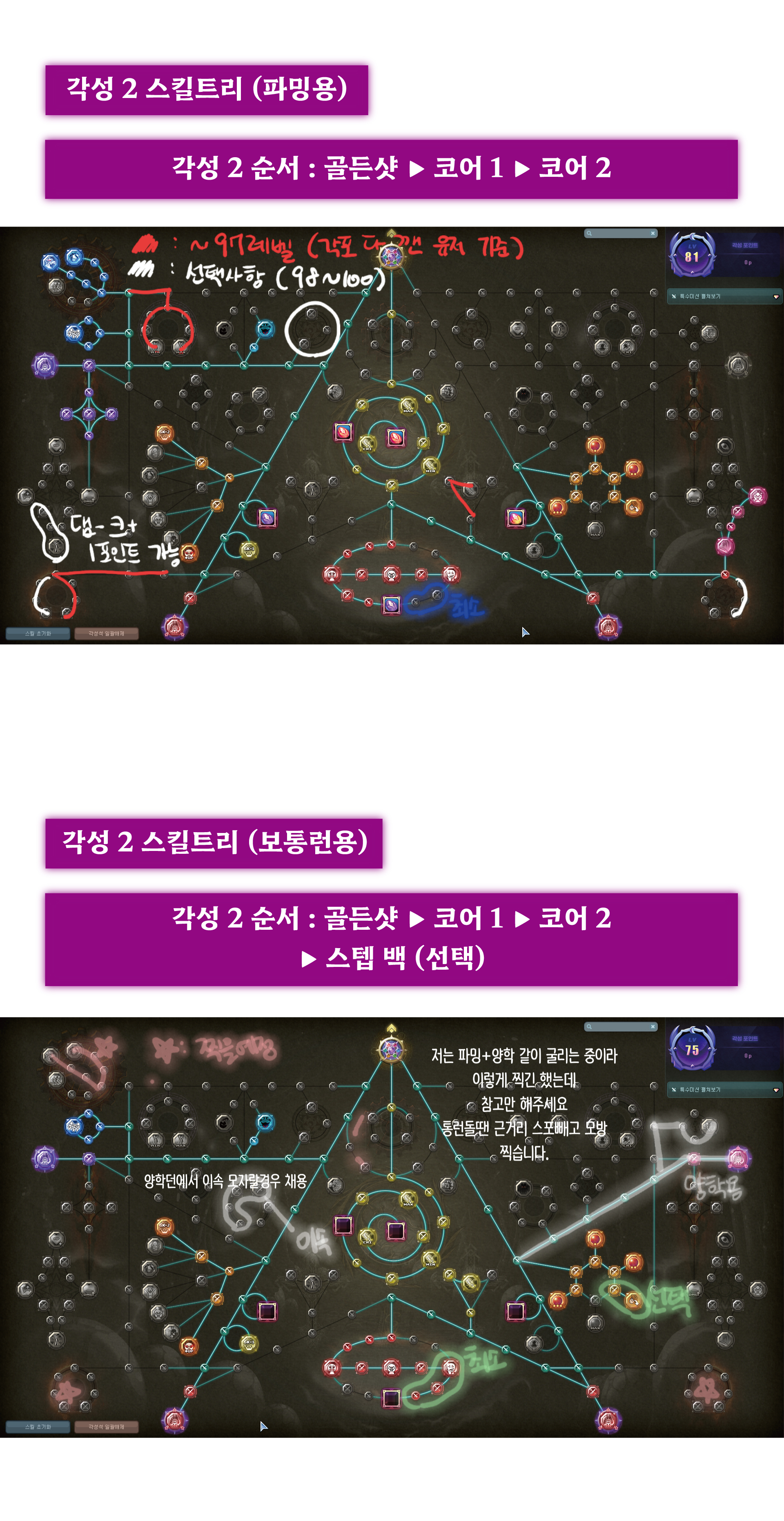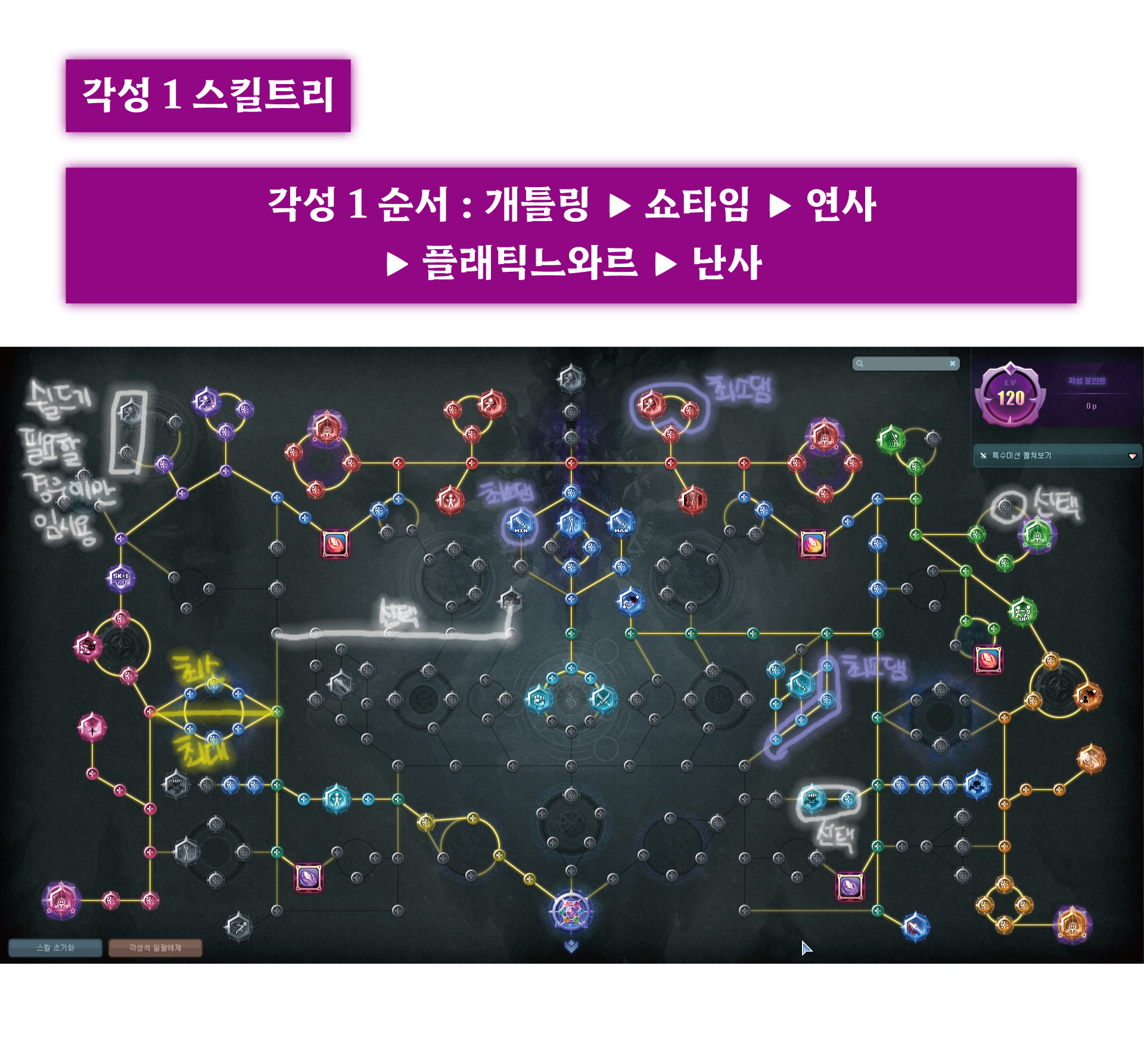 제가 작성한 각성1 스킬트리 순서의 의미는 '초기화를 안하고 최대한 적은 각성포인트로 스킬 들을 빨리 찍기 위함' 입니다.(귀찮으니까)