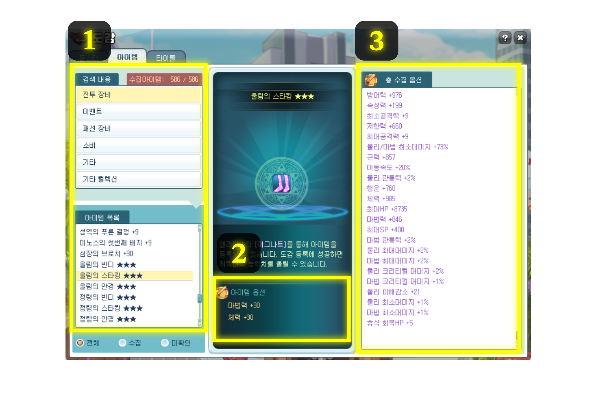 | 리카리아의 브로치 +30 | 생명의 엔텔레케 | 물리/마법 최소대미지 +3% / 물리/마법 최대대미지 +3%