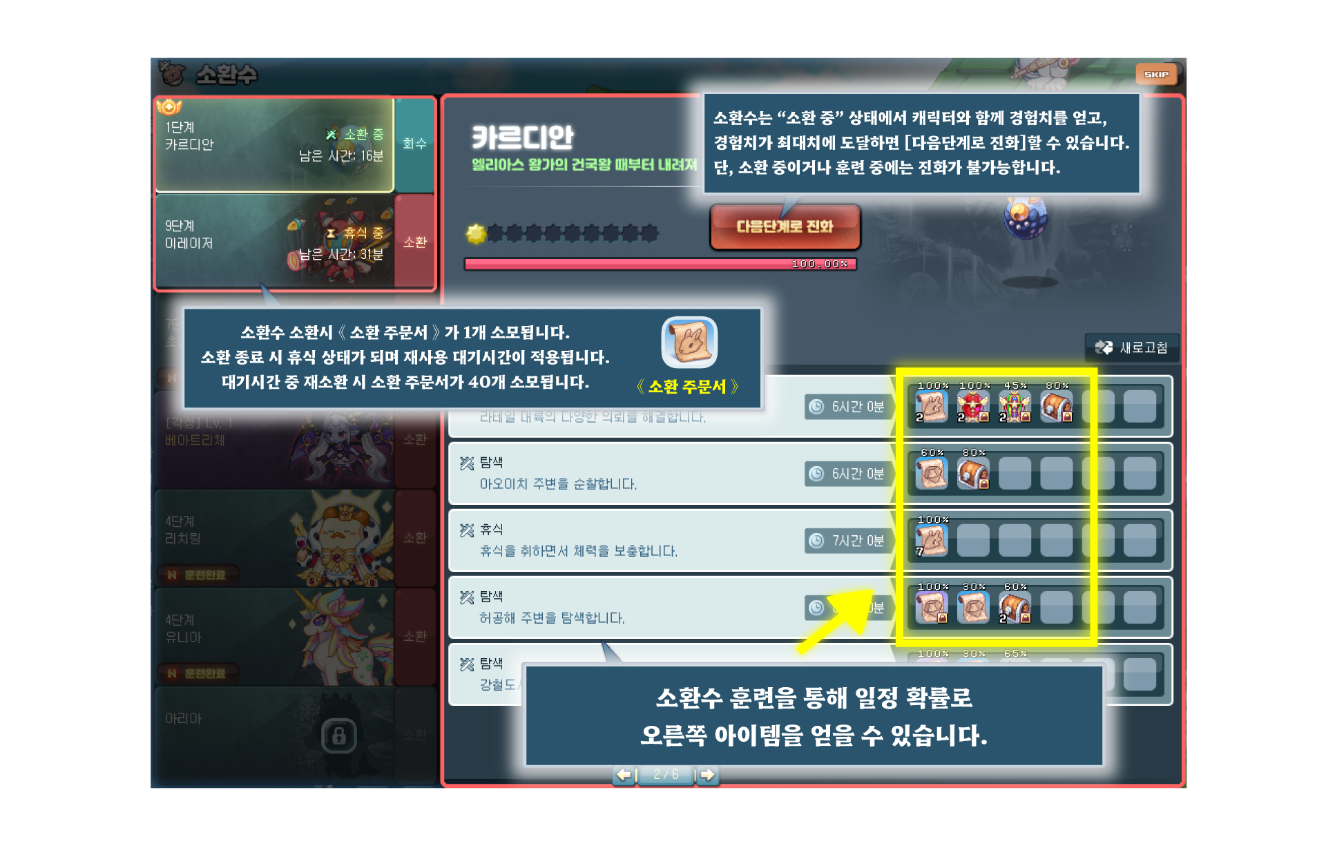 ▶ 소환수는 다양한 아이템과 버프를 통해 소환수 획득 경험치율을 높일 수 있으며 목록은 아래와 같습니다.