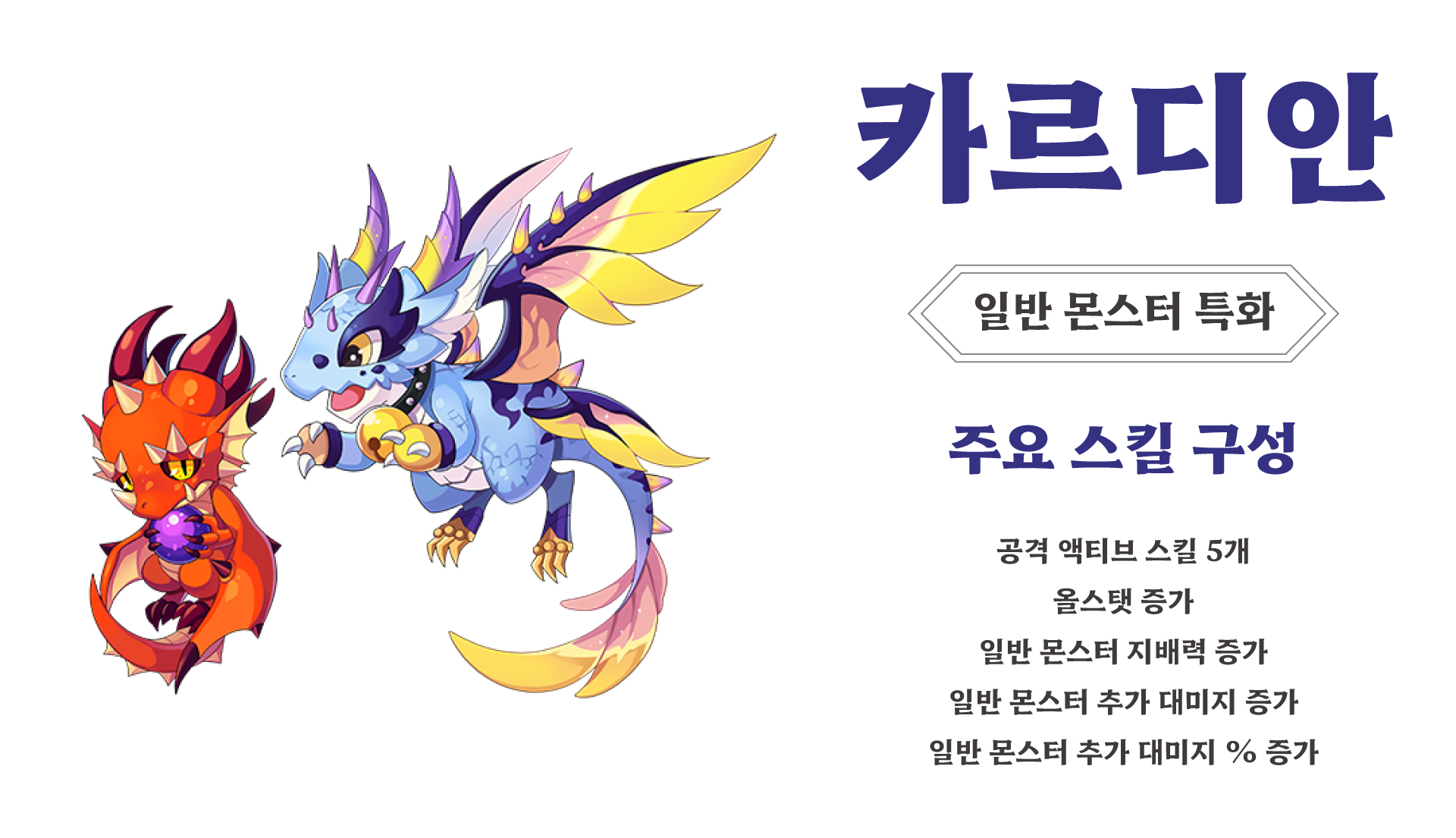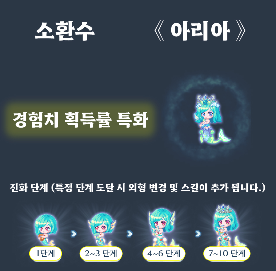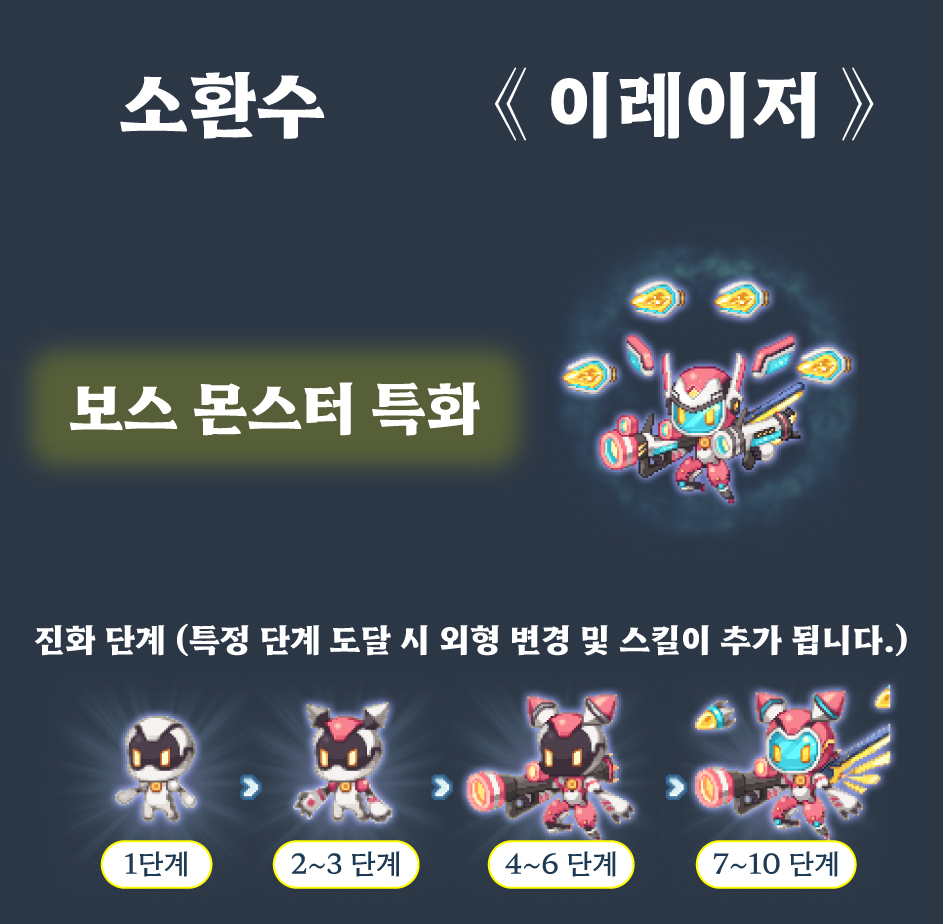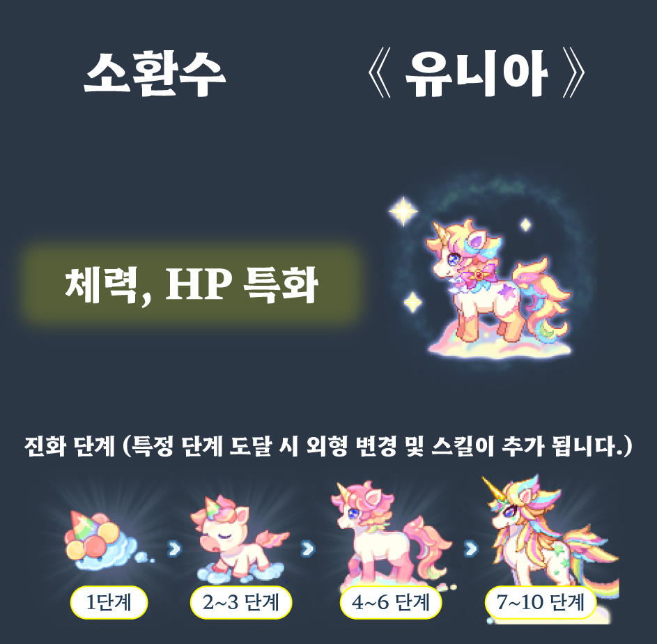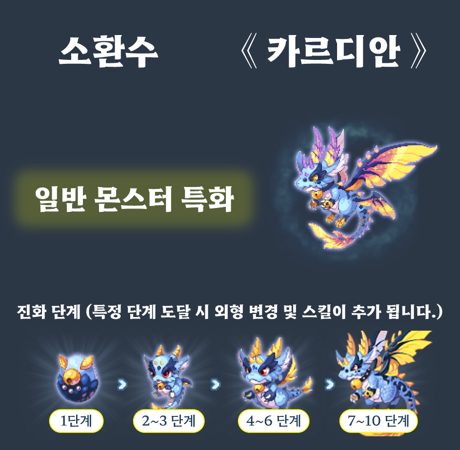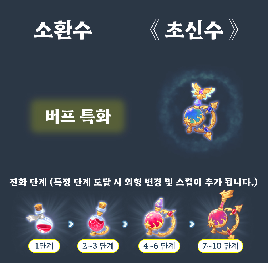 ▶ 소환수마다 특화된 특징들이 있으며, 단계에 따라 외형과 스킬이 추가됩니다.